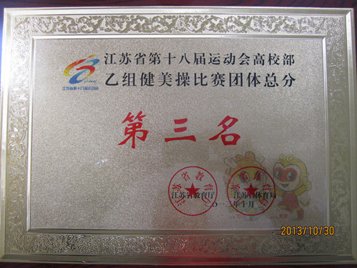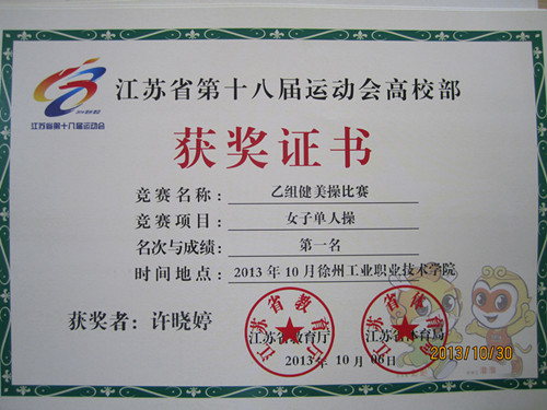 日前,在徐州工业职业技术学院举行了江苏省18届运动会高校部乙组健美操比赛,来自全省高职院校近130多名运动员参加了比赛,我院健美操队长期坚持训练,参加了7个项目的比赛,在比赛中教练员冷静指挥,运动员不畏强手,发挥了水平。最后许晓婷荣获女子单人操第一名,李璐君、杨竣宇、许晓婷荣获三人操第三名,我院还荣获团体第三名的好成绩。