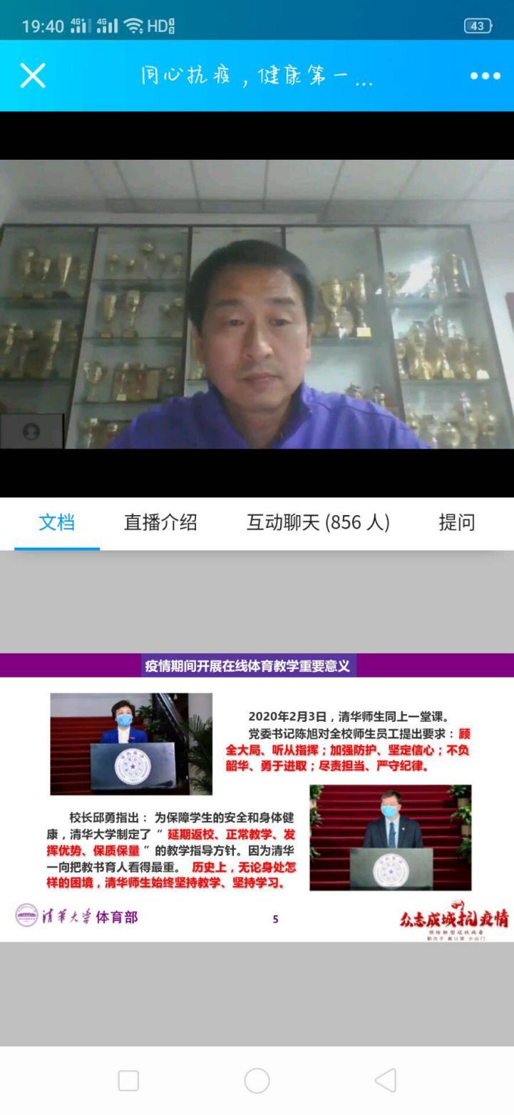 刘波教授在直播中首先介绍了清华大学党委书记陈旭对全体师生员工的要求和校长邱勇的制定的教学方针。另外通过电影片段、作报告以及教学经验分享的形式阐述了疫情期间开展在线体育教学的重要意义,并介绍了清华大学课外锻炼的具体情况,他指出历史上无论身处怎样的困境,清华师生始终坚持教学,坚持学习的道理,体现出疫情期间体育教学的重要性以及在线体育教学产生的影响。