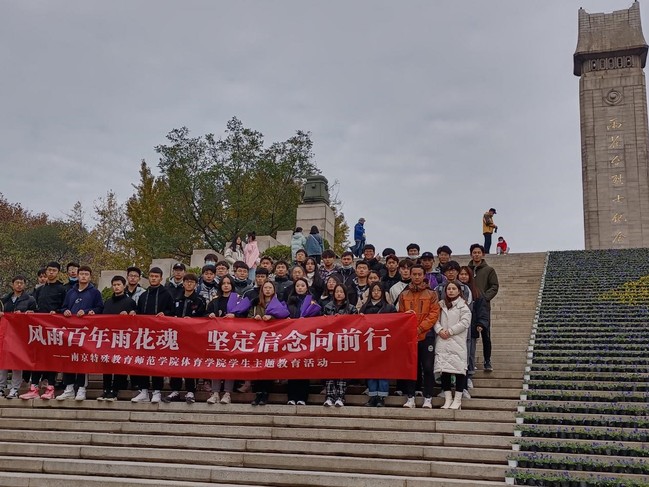 而后,老师和同学们手持菊花,在雨花台烈士纪念碑前凭吊先烈。学生代表王越和温凯璇在纪念碑前演讲,表达自己对革命先烈的敬畏之情。江子健同学带领同学们进行庄严宣誓,表达自己奉献国家的决心。在教师发言中赵伟健老师指出,革命先烈为了国家民族牺牲的无私、大无畏精神是值得我们学习的。作为一个体育人,我们必须要有坚定的信念和团结的精神,坚定跟党走,团结一心推动KY开元集团官网入口做大做强。努尔老师也表示,我们现在所处的是一个和平的年代,都是那些先烈的功劳。我们要严格要求自己,用自己的行动去报效祖国。随后,带队老师和同学们前往烈士就义群雕前进行瞻仰。师生们在“风雨百年雨花魂,坚定信念向前行”的横幅上集体签名,表达自己的爱国情怀和对国家美好的祝愿。