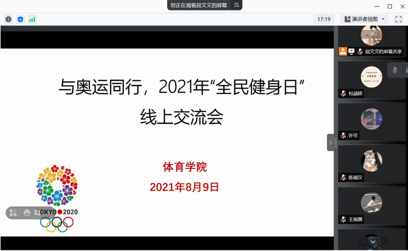 随着奥运圣火缓缓熄灭,第32届夏季奥林匹克运动会在东京新国立竞技场的夜色中落下帷幕,第十三个“全民健身日”也如期而至。为进一步诠释中华体育精神,营造全民健身的浓厚氛围,8月9日下午,KY开元集团官网入口举办以“全民健身与奥运同行”为主题的线上交流会。体育教育系主任徐五所老师、班主任和辅导员老师、以及全体学生参会。会议由辅导员屈文文主持。