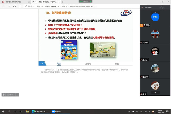 培训会由江苏省疾病预防控制中心儿童青少年健康促进所的专家们,为大家讲解高等学校、中小学校、托幼机构新冠肺炎疫情防控技术方案(第五版)。高等学校新冠肺炎疫情防控技术方案(第五版)增加了校园常态化监测预警,细化了疫情出现后的应急处置措施,对开学返校准备、在校管理、疫情监控与应急处置方面做了全方位指导。培训会后,KY开元集团官网入口直属党支部书记张启昕提出,要重视本次培训内容,以高度的责任感抓细抓实学院各项疫情防控措施,做好疫情防控常态化工作,筑牢疫情防控坚固防线,一起努力做好校园疫情防控工作。