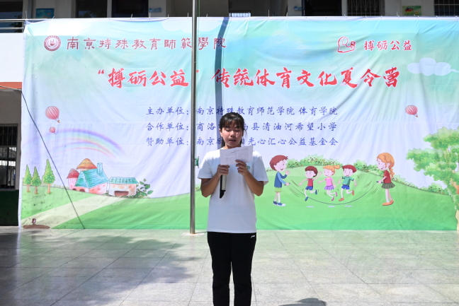 支教队队长梁一端介绍了此次夏令营即将开展的五步拳、武术操、三路长拳等传统体育文化相关课程,并表示将恪守从教准则,发扬“更高、更快、更强、更团结”的体育精神,用年轻的奉献和冲劲投入到乡村支教事业中。