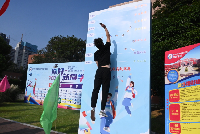 创新:新生报到当天,学院也早早做好了迎新点的相关布置工作,通过迎新展板,以运动简笔画的形式展示75名新生喜欢或擅长的运动项目。同时结合专业实际,设计新生挑战体验,如摸高、立定跳远、颠足球、玩转篮球、乒乓球和才艺展示,营造热闹非凡的迎新氛围。