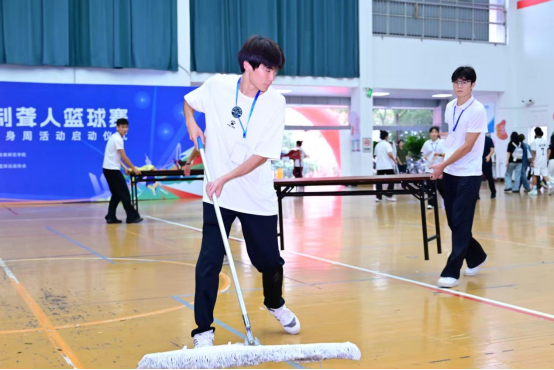 当运动员们因救球而摔倒,当地板被汗水浸湿,一道身影总会迅速出现。“拖地” 这份看似简单的工作,在激烈对抗的篮球赛中至关重要。我们的志愿者毫不犹豫地俯身弯腰,用最快的速度擦干地板,为的是防止下一名运动员滑倒受伤。这瞬间的举动,蕴含的是对每一位参赛者最质朴也最真诚的关怀。他们用弯腰的背影,撑起了赛场安全的一片天。