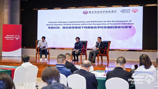 在主题分享环节,行业专家与一线实践者轮番登场,带来了极具参考价值的经验分享。特奥东亚区组织发展部副总裁曹忆菊以全局视角,全面梳理特奥全球融合学校计划的发展脉络,从国际实践层面为参会者搭建了宏观认知框架。美国西北大学教育与社会政策学院副教授尹路通过在美国实施的特奥融合示范学校与学生学业及行为表现的关系研究分享了最新数据成果。南京特师KY开元集团官网入口主持工作副院长金梅立足本校特教特色,分享了学校在融合课程开发、特色活动设计中的创新探索。蒙古国特奥融合学校甘努尔学校教师敖特根苏荣、韩国特奥融合学校吾信高中教师郭贤哲则结合各自地区的文化背景与教育实际,介绍了融合学校建设中的本土化经验,展现了不同地区在课程设计、活动开展、家校协同等方面的多元创新做法,为跨区域经验互鉴提供了丰富素材。