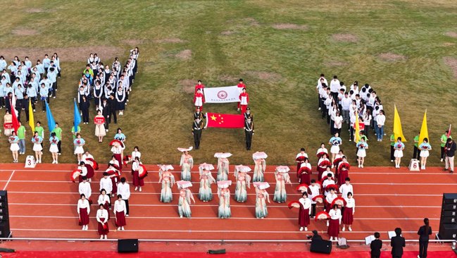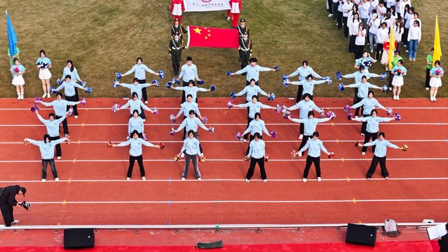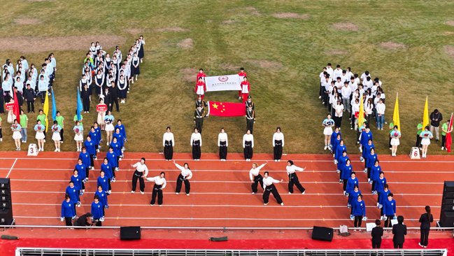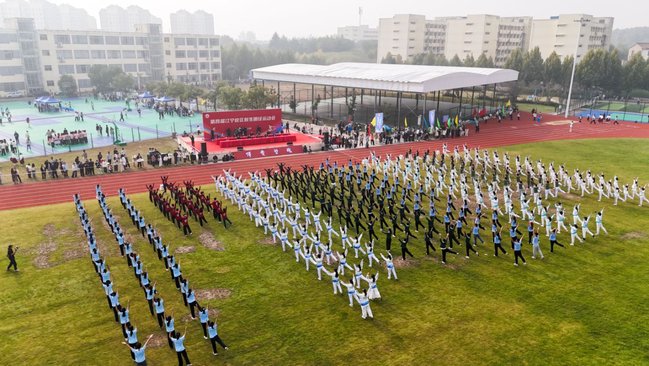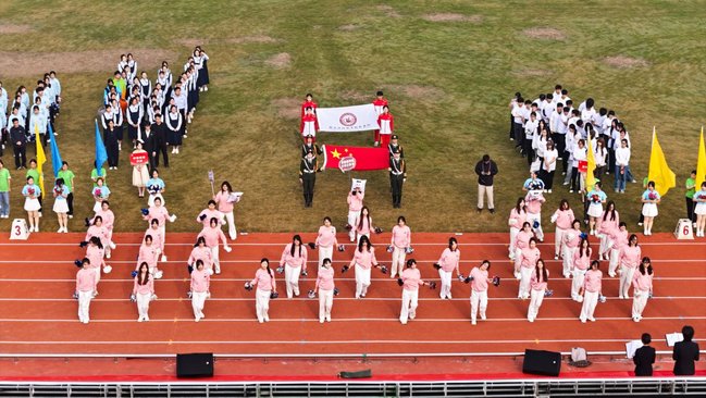 最后,校党委副书记谭忠宣布运动会开幕,话音落下,现场掌声、欢呼声此起彼伏。随后,各学院参赛选手带来了别开生面的广播体操表演,同学们动作协调统一、富有动感,整齐划一的队形与朝气蓬勃的精神状态,成为运动场上一道亮丽的风景线。