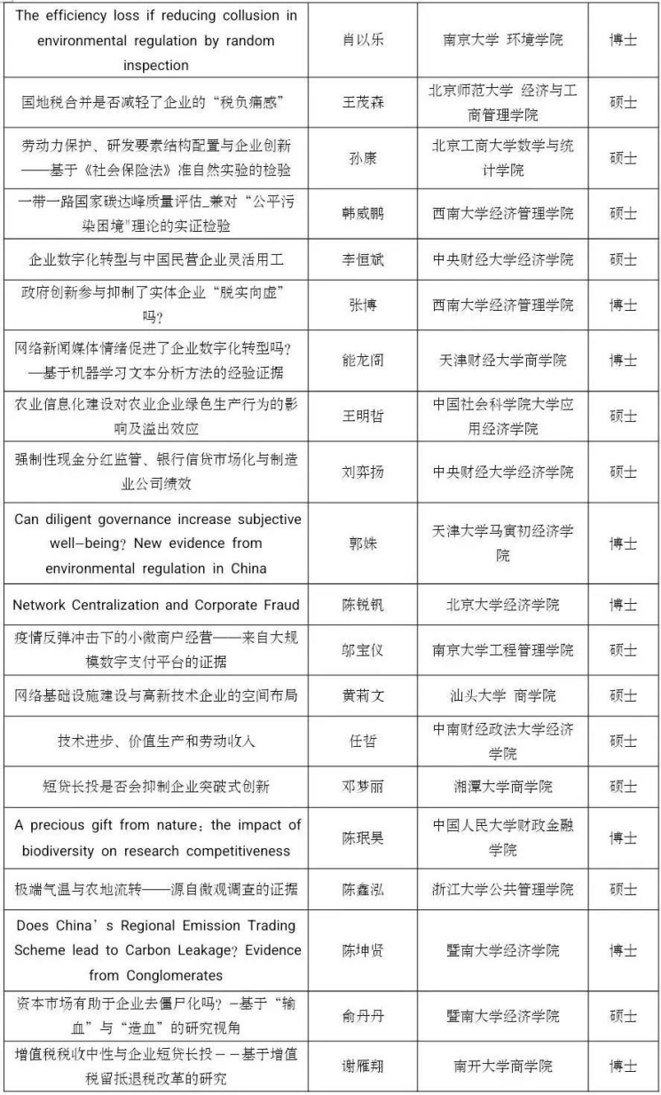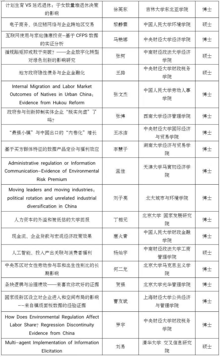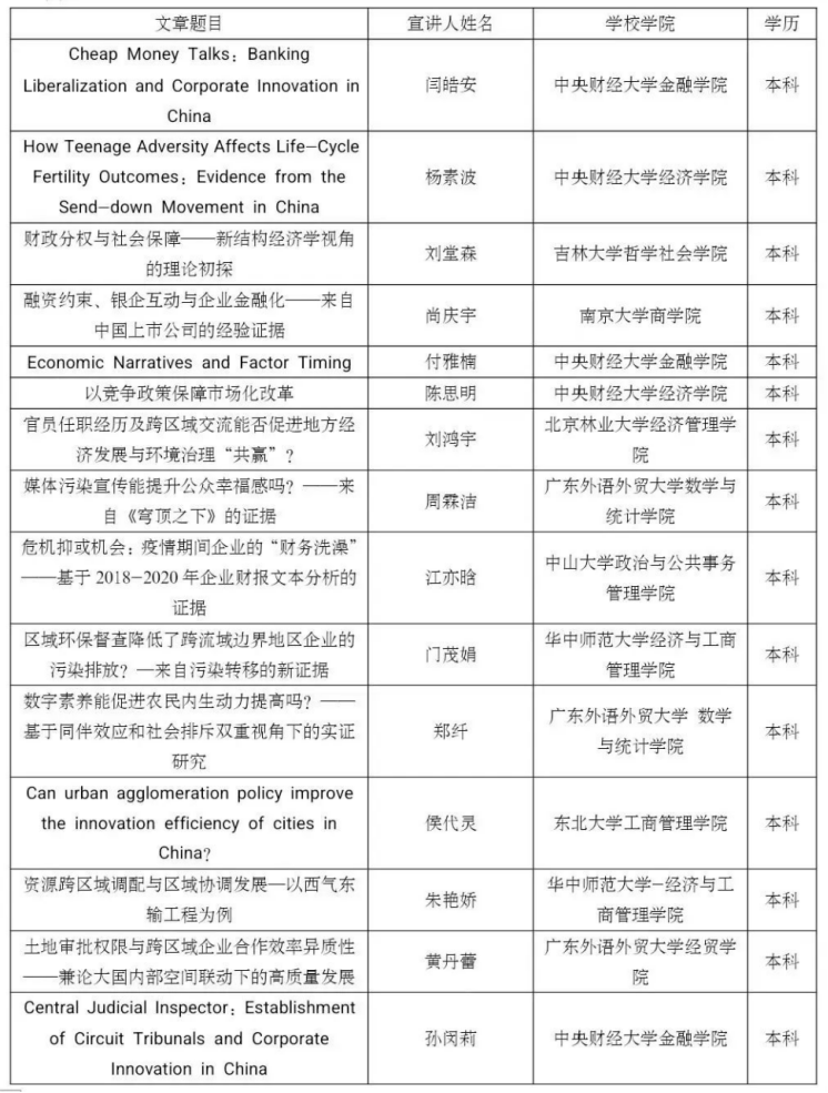 党的二十大报告指出,“教育、科技、人才是全面建设社会主义现代化国家的基础性、战略性支撑”。为了学习、贯彻和落实党的二十大关于教育和人才建设的精神,开云kaiyun体育联合中国经济学年会、中国青年经济学家联谊会主办第五届未来经济学家论坛。本论坛坚持“公平、公正、公开”的原则,鼓励思想争鸣、学术创新,旨在为未来有志于从事经济学研究的全国高校在校学生(本科生和研究生)提供一个观点交流、思想碰撞的学术交流平台。本次论文征集环节共收到612篇投稿论文,经过评审论证和评审,最终遴选出126篇入围会议,名单如下,恭喜各位入选的同学:
