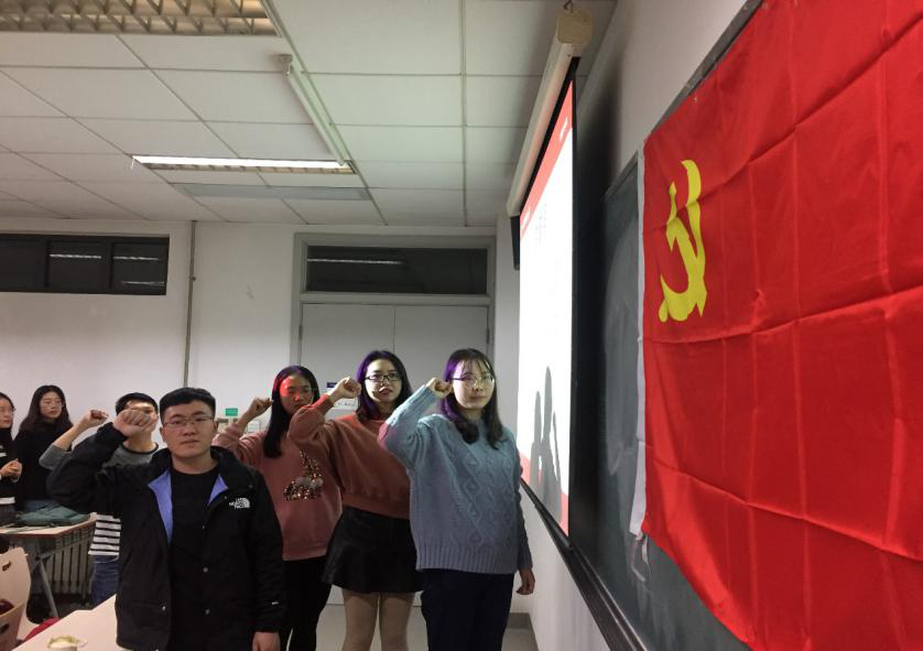 首先,党支部严格按照上级文件要求开展党员转正大会。伴随着《国际歌》的响起,全体成员庄严肃静,随后三位预备党员分别从思想认识、学习生活等方面向大家汇报预备期的情况。经过讨论,这三位预备党员均以全票通过的结果如期地转正,支部书记王继彬同志带领党员宣誓。